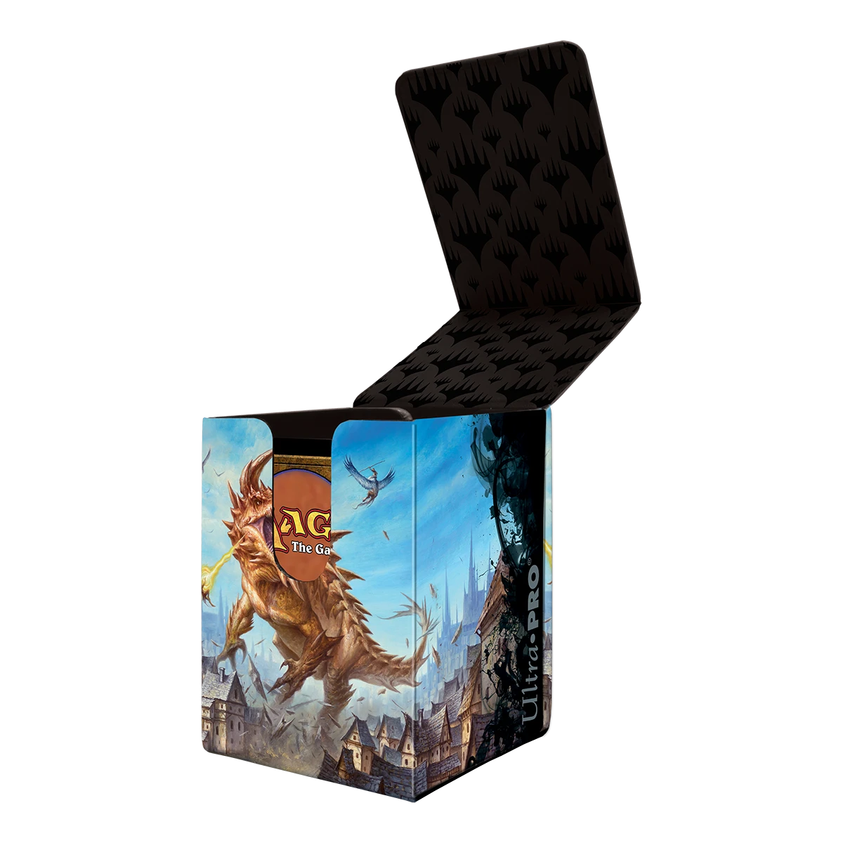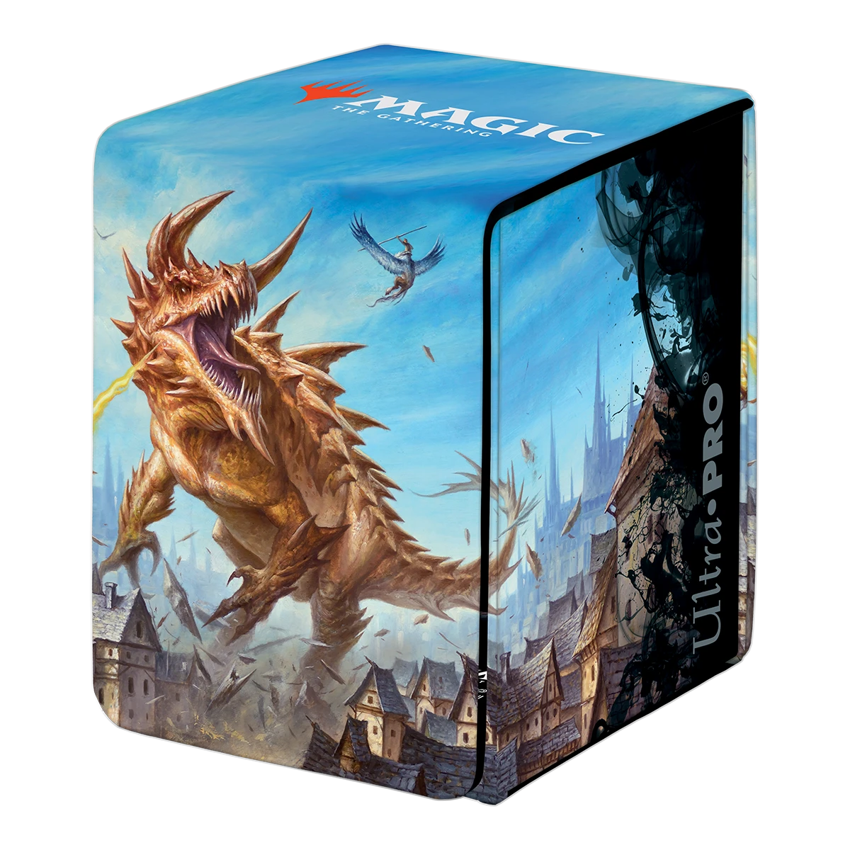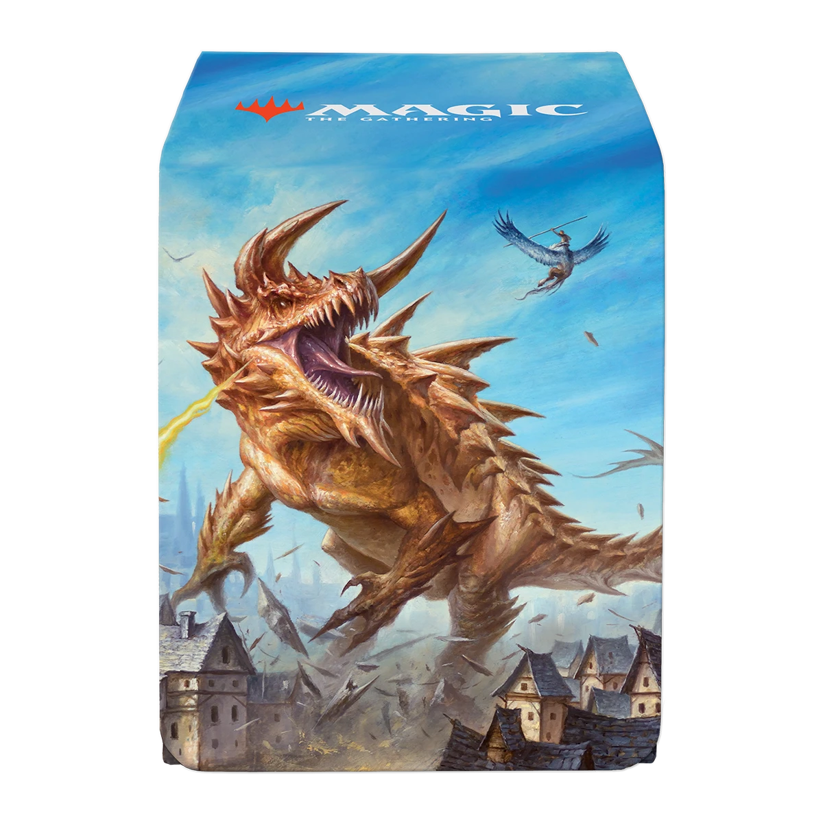 The Adventures in the Forgotten Realms The Tarrasque Alcove Flip Deck Box for Magic: The Gathering features a vibrant, full-color leatherette finish, strong magnetic closure, and dual thumb notches for easy access to your deck. This Alcove Flip Deck Box holds up to 100 standard size trading cards double-sleeved in Ultra PRO Deck Protector sleeves.