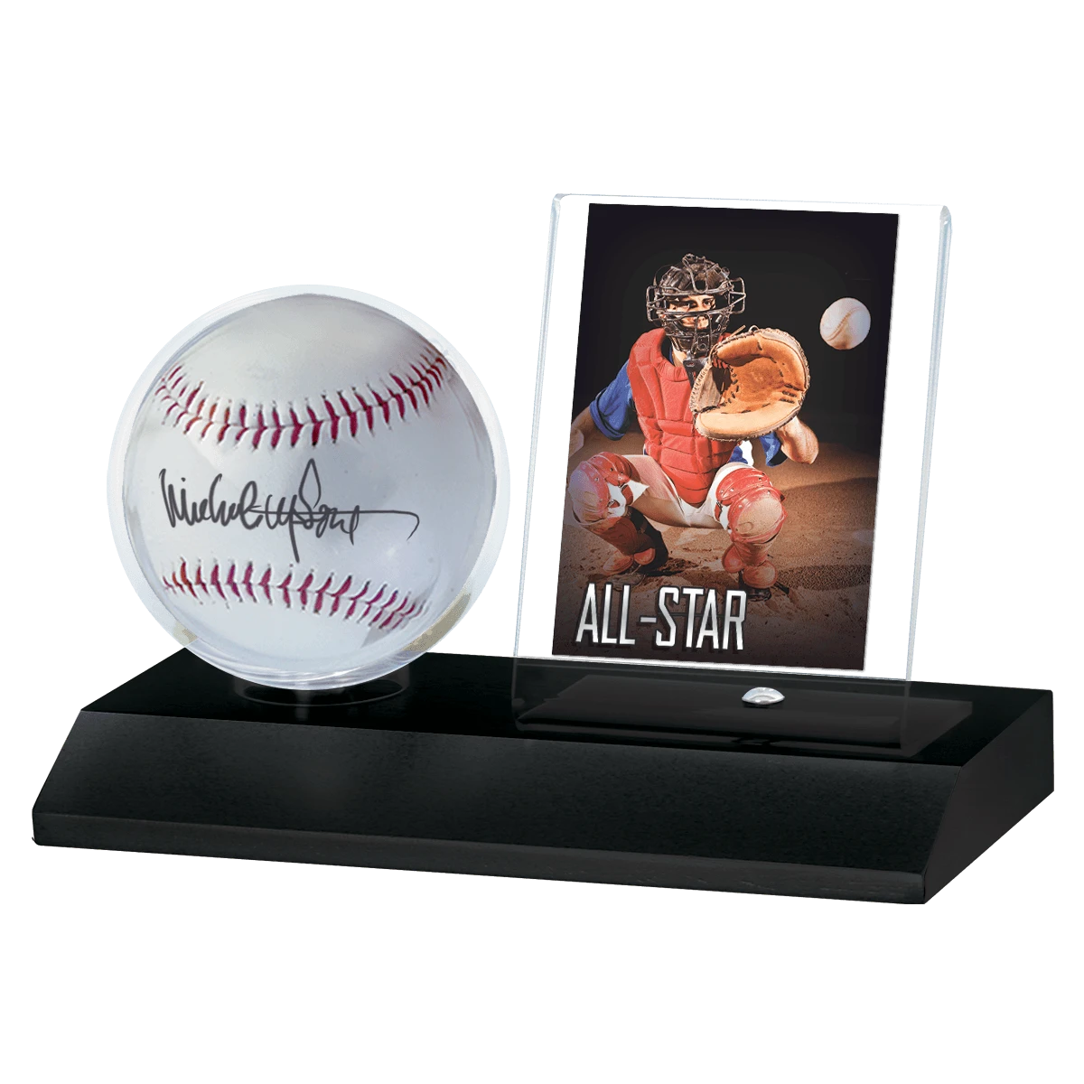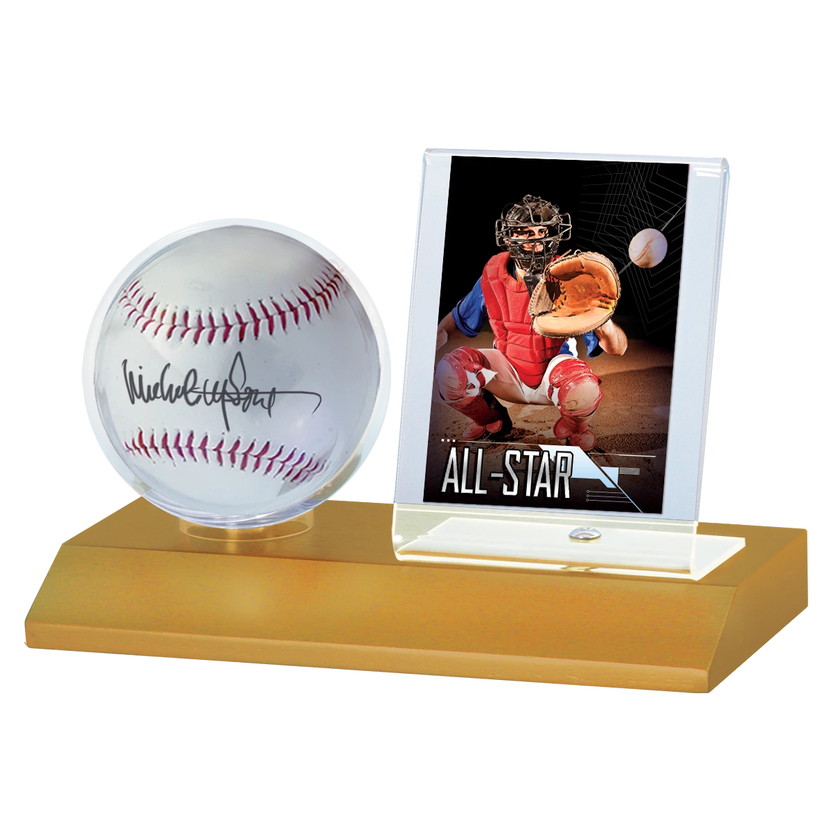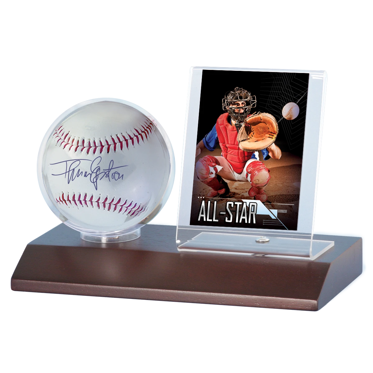 - Baseball and cardholder are both displayed on a sleek wood stand that is sure to fit any decor
