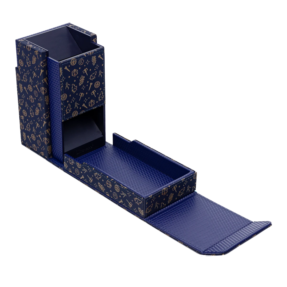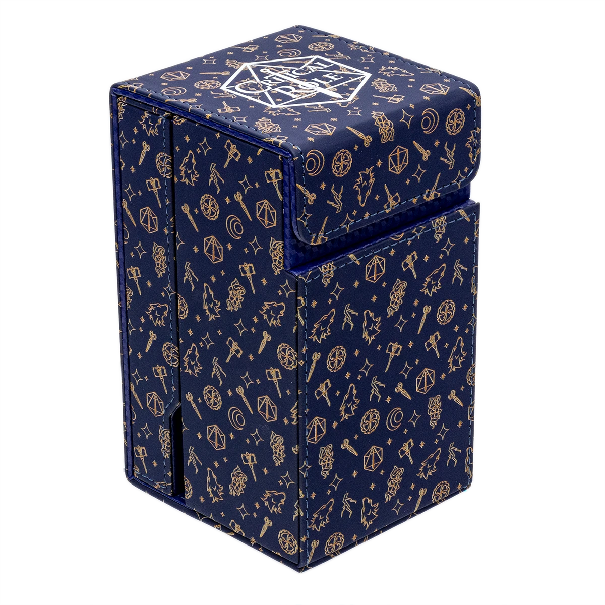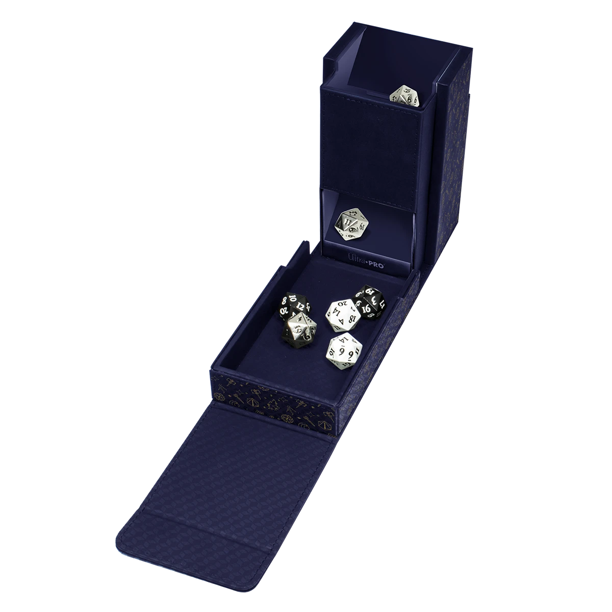 The Printed Dice Tower for Critical Role Bells Hells is the ultimate tabletop gamer’s companion. Equipped with a soft suede leatherette exterior and durable core, you can store and roll dice all in a single 3.75 in. x 3.35 in. x 5.90 in. space. The lid flips down to release dice into a walled dice catching tray. Drop dice through 3 injection molded ramps to ensure durability and randomized rolls. When you are done playing, you can flip up the attached tray to store 40+ standard sized RPG dice and secure the dice tower shut with the strong magnetic closure that Ultra PRO’s Alcove accessories are famous for. (Dice not included)