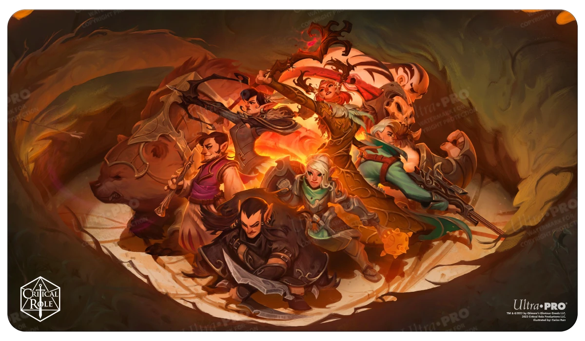 Bring your favorite adventures to the table with the Vox Machina Playmat for Critical Role. Made with a soft fabric top and rubber backing, not only will your cards, miniatures, or specialty dice be protected, but also the table below when rolling dice. With dimensions of approximately 24 in. x 13.5 in., this playmat is also the perfect decorative oversized mousepad for your home or office. Non-slip rubber backing lets the playmat lay flat and prevents it from shifting during use.