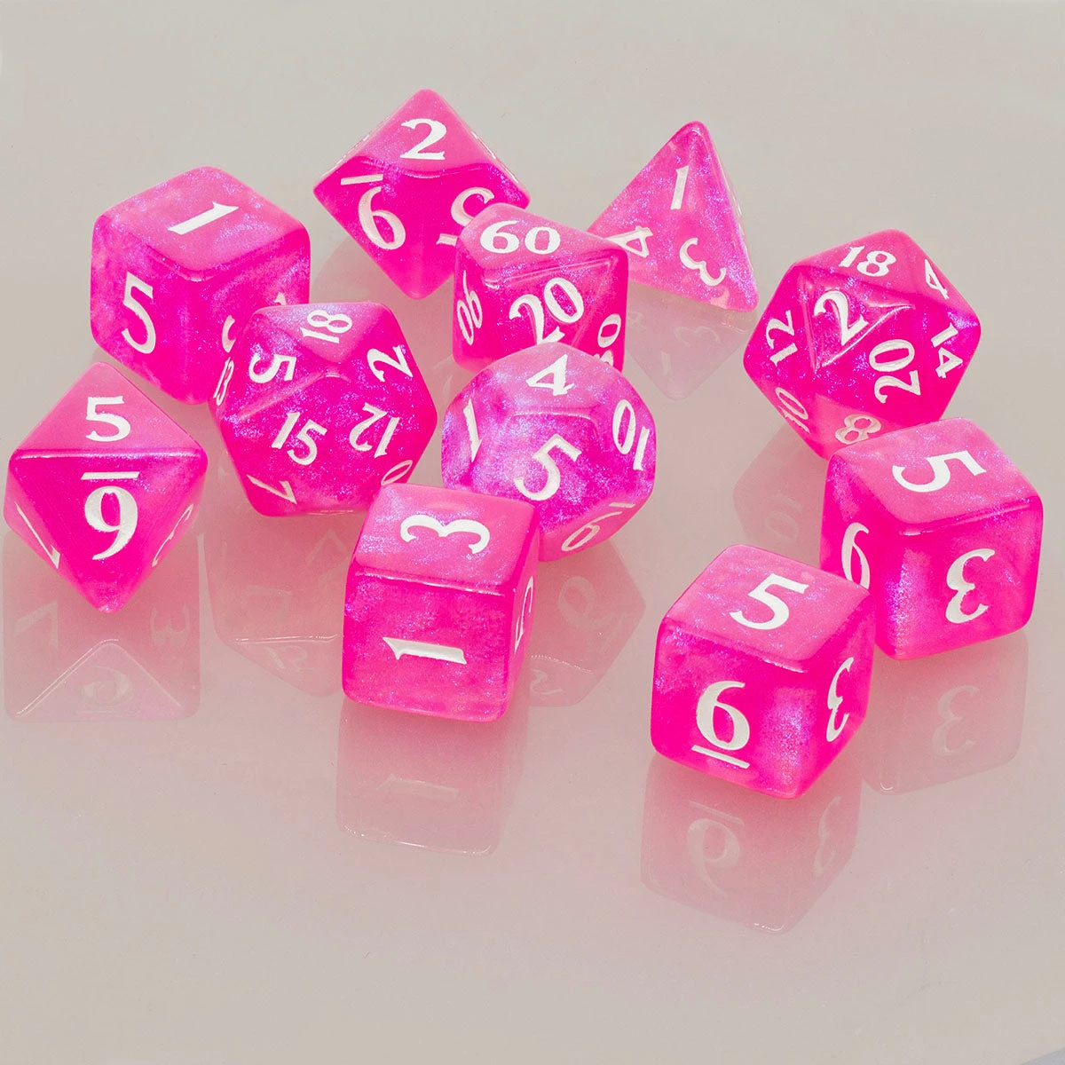 - Each set includes eleven (11) shimmering acrylic dice in a 2-piece storage box: