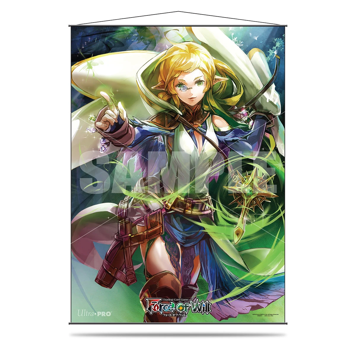 Feature your favorite Force of Will Trading Card Game characters and moments with this officially licensed, full color wall scroll. Constructed with premium, silky fabric material, black rods, and black rope hanging cord, this wall scroll is sure to liven up your play space. Ultra PRO wall scrolls are made with the highest quality with vibrant print colors, high resolution details, and soft, premium fabric with a silky touch. Dimensions are approximately 26.8 x 37.4 in. This officially licensed product is made only by Ultra PRO International – authenticity can be verified by the “UP” logo imprint on the rod ends. This wall scroll shows the full art of “Fiesthing, Master Magus of Holy Wind”.