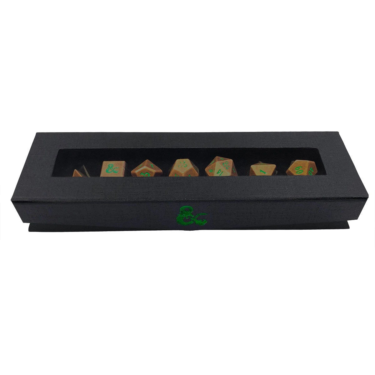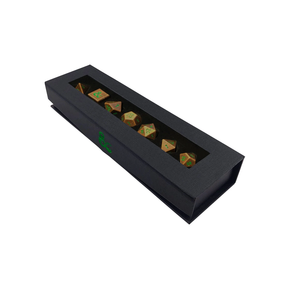 Ward off enemies on your next adventure with the commanding roll of these official Dungeons & Dragons Heavy Metal Feywild Copper and Green RPG dice! Made from the same heavy, zinc alloy material as the Heavy Metal D20 sets, rolling these dice will send a rumble through the realm! The set includes one each: D4, D6, D8, D10, D12, D20, and a Percentile Die – all the dice you need for your next D&D adventure!