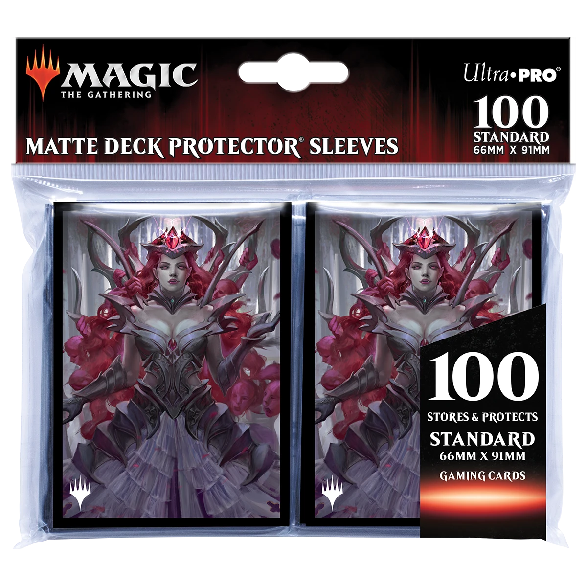The 100ct Deck Protector® sleeves for Magic: The Gathering Innistrad Crimson Vow feature full-color artwork of Olivia, Crimson Bride and are made with our proprietary ChromaFusion technology to prevent peeling. Archival-safe polypropylene materials ensure you can sleeve your cards with confidence. Sized for standard size trading cards measuring 2.5 in. x 3.5 in. The matte finish offers a glare-free, camera ready play experience!