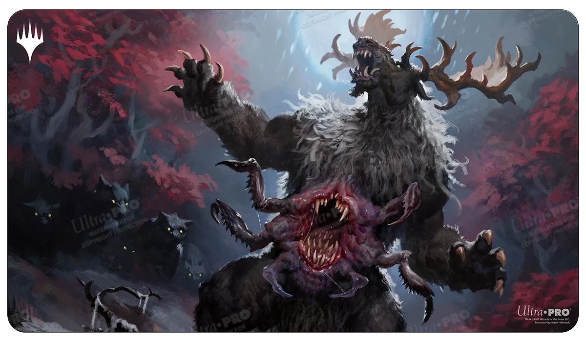 Playmats feature exclusive crops of popular Magic: The Gathering Innistrad Crimson Vow artwork of Ulvenwald Behemoth. Made with a soft fabric top to reduce damage to cards during play and a non-slip rubber backing to keep the playmat from shifting during use, playmats enhance the gameplay experience. With dimensions of approximately 24 in. x 13.5 in., a playmat also makes an excellent oversize mousepad for home or office.