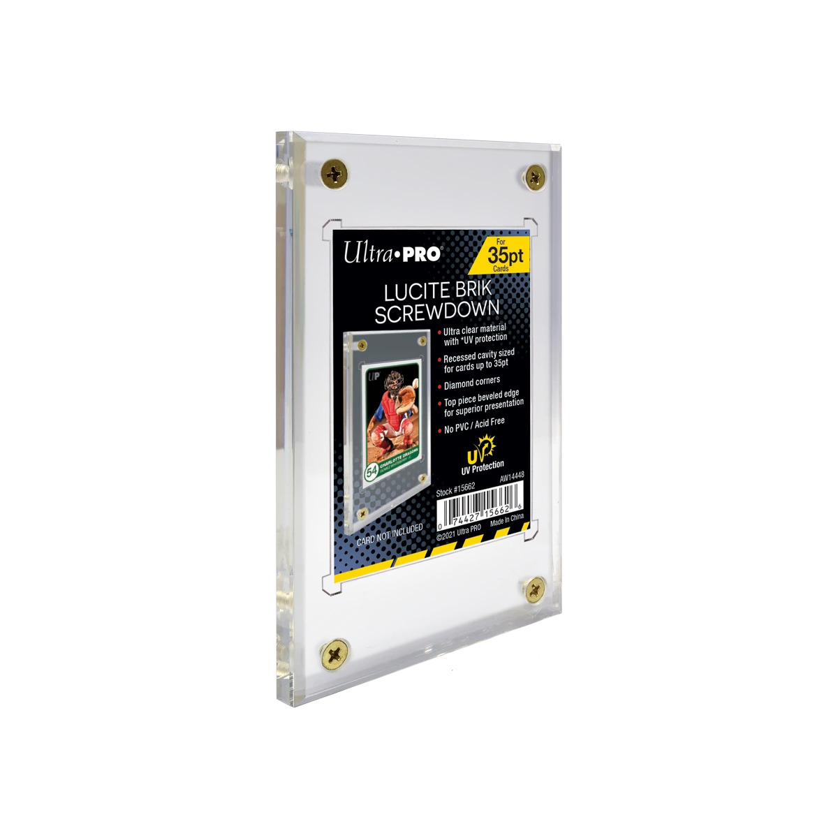 The Lucite Brik Screwdown features a 35pt recessed area with diamond corners and is designed to hold standard cards 2-1/2′ x 3-1/2″. Superior quality Lucite slabs with four-screw closure on each corner and beveled edges for a premium look. Lucite has special additives to protect your valuables from harmful UV rays. Can be displayed vertically or horizontally.