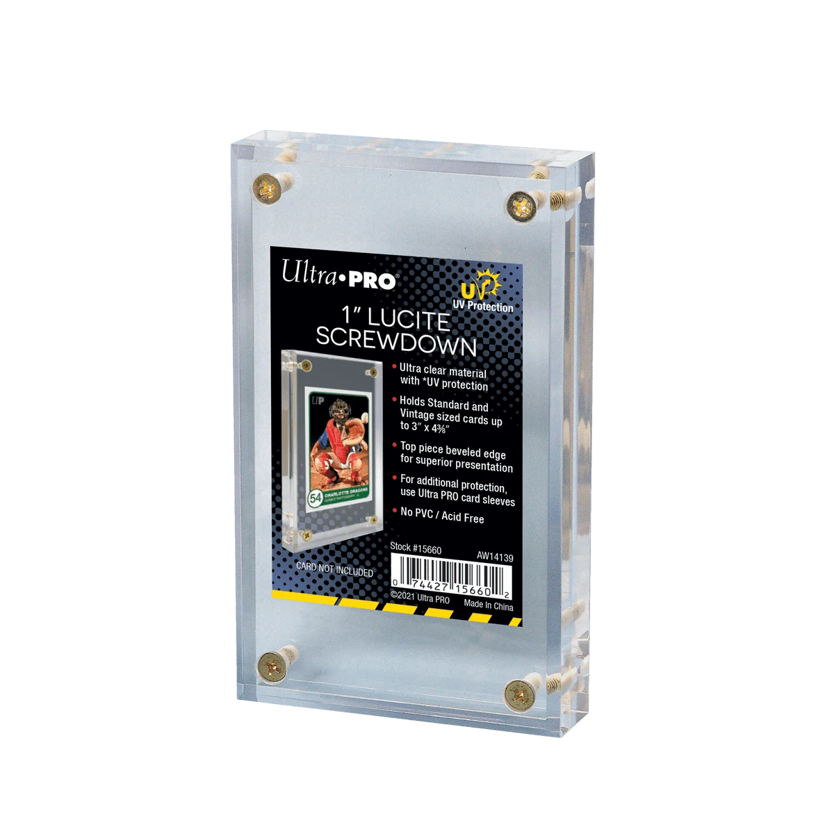 1″ thick non-recessed holder designed to hold standard cards, small photographs, and vintage cards up to 3″ x 4-3/8″. Superior quality Lucite slabs with four-screw closure on each corner and beveled edges for a premium look. Lucite has special additives to protect your valuables from harmful UV rays. Recommended for use with Ultra PRO sleeves to maintain archival safety. Can be displayed vertically or horizontally.