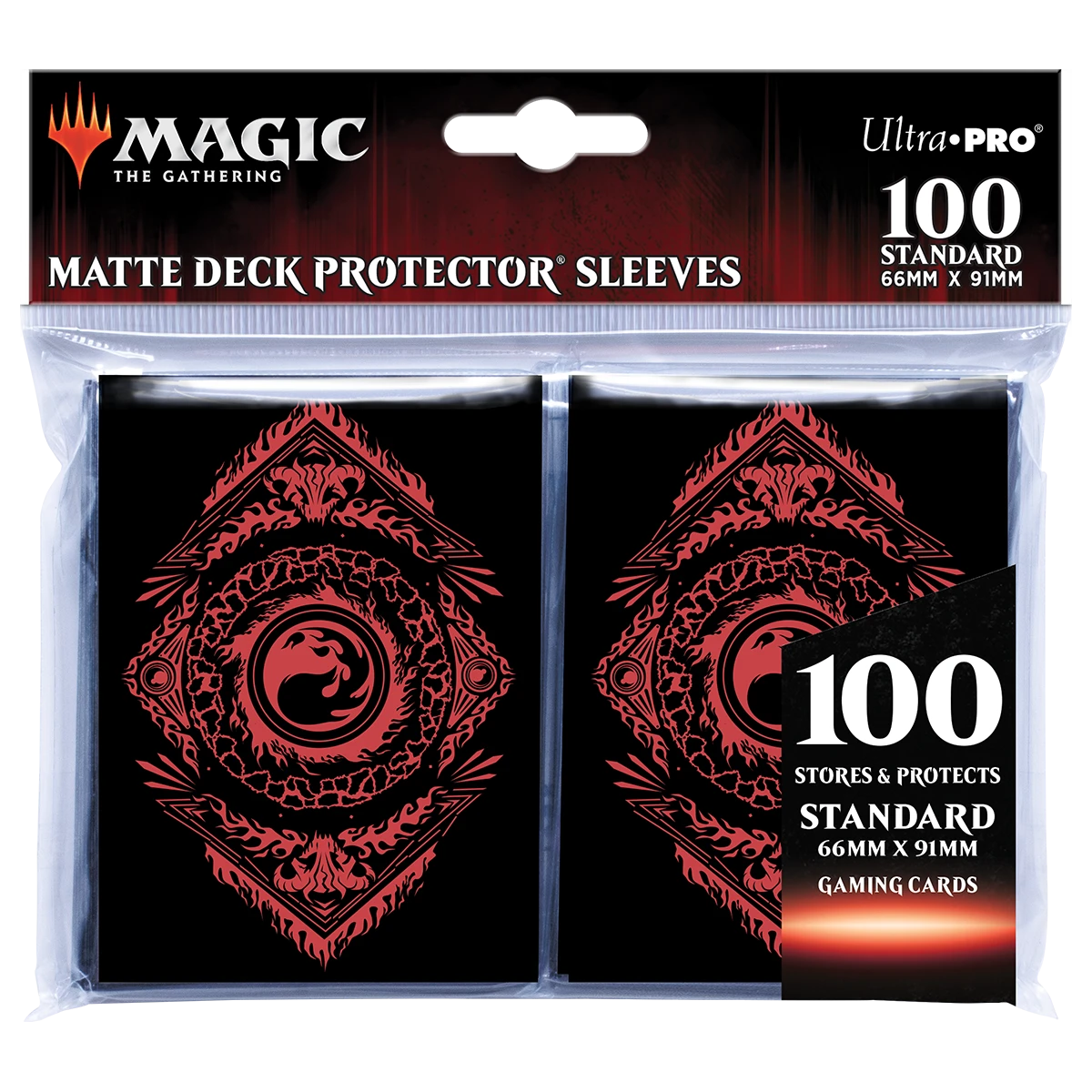 The 100ct Deck Protector® sleeves for Magic: The Gathering feature full-color artwork and are made with our proprietary ChromaFusion Technology™ to prevent peeling. Archival-safe polypropylene materials ensure you can sleeve your cards with confidence. Sized for standard size trading cards measuring 2.5 in. x 3.5 in. The matte finish on the front offers a glare-free, camera ready play experience, while the shiny back brings out the beautiful artwork!