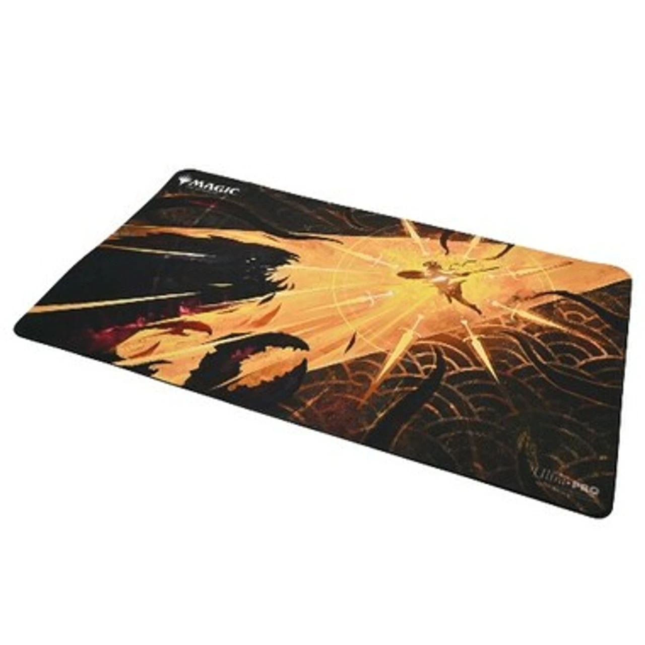 Up your game at your next game night with this official Magic: The Gathering playmat showcasing highly detailed and vibrant artwork from popular trading card game. Made with a premium fabric top to prevent damage to cards during game play for tabletop gamers. With dimensions of approximately 24″ X 13-1/2″, this playmat is also the perfect decorative over sized mouse pad for computer and laptop workstations. Non-slip rubber backing lets the playmat lay flat and prevents it from shifting during use.