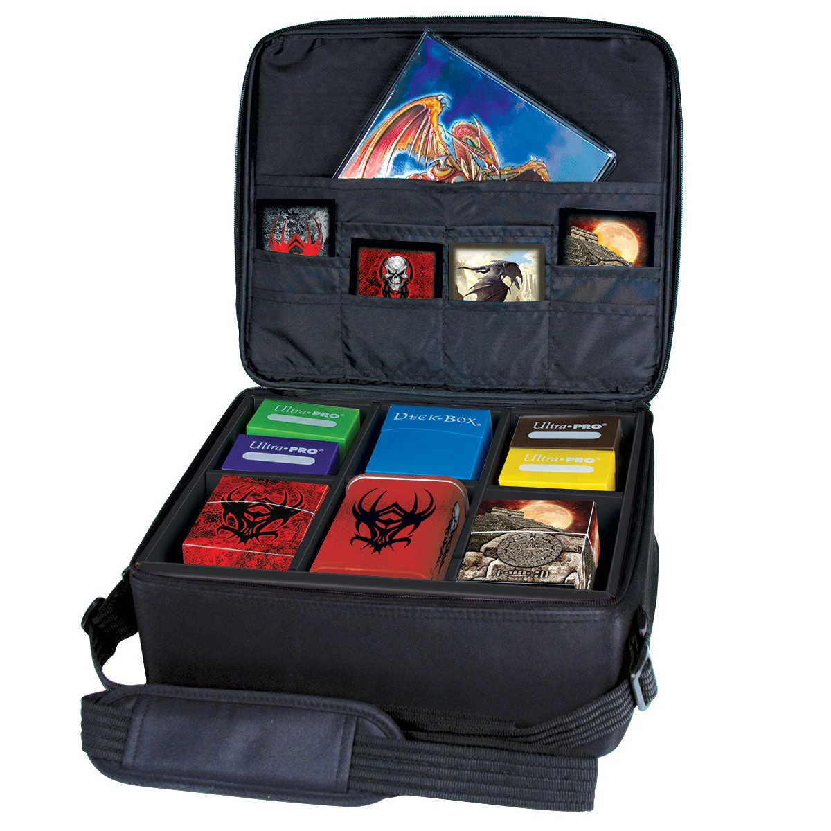Shoulder bag with an adjustable strap and compartmentalized insert designed to hold collectible cards in Ultra PRO Deck Protector sleeves, deck boxes, and other gaming accessories.