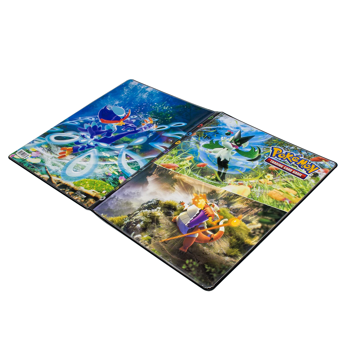 - Officially licensed Pokémon Trading Card Game 9-Pocket Portfolio featuring Skeledirge, Meowscarada, and Quaquaval from Pokémon Violet and Scarlet