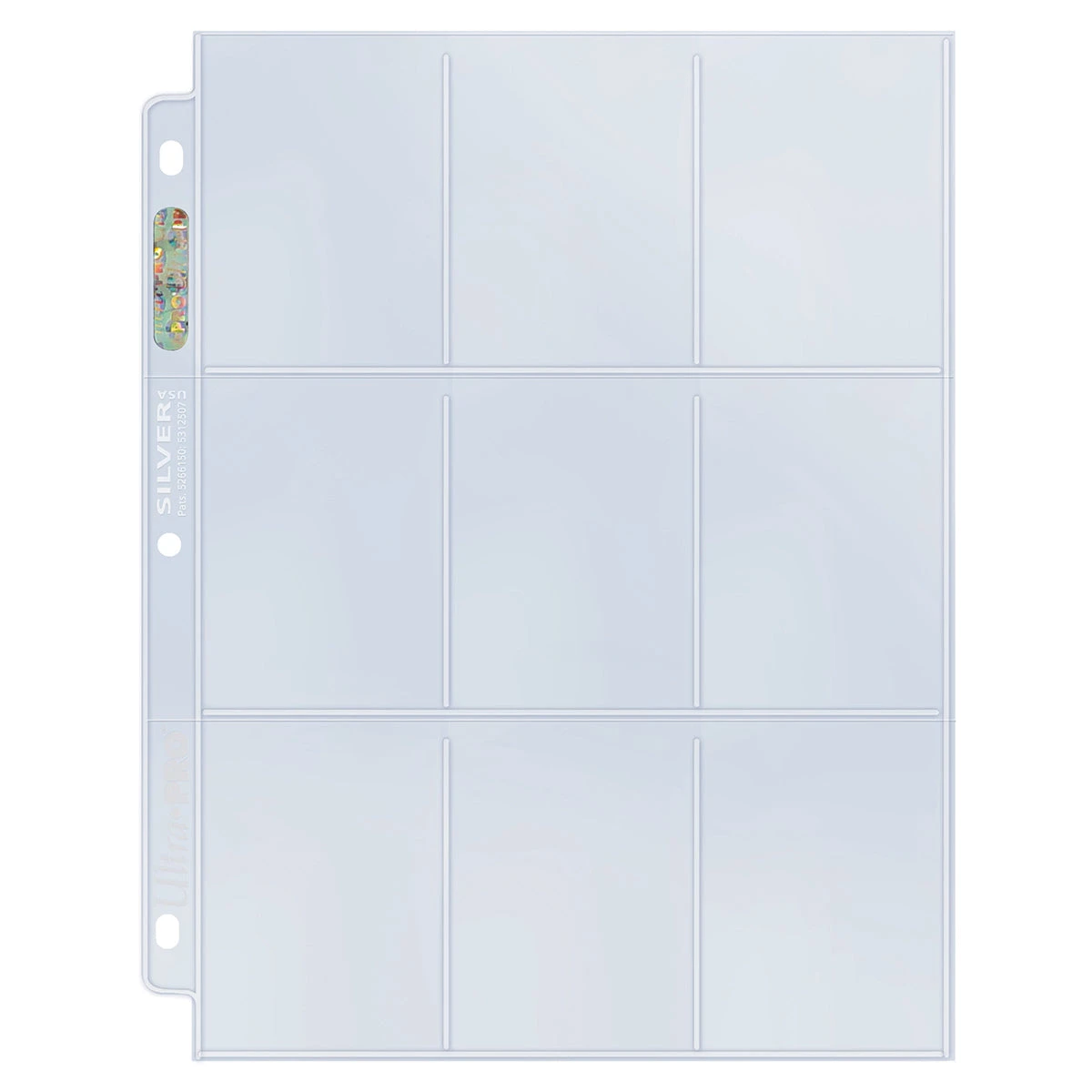 Protect, sort, and store your standard size (2-1/2″ X 3-1/2″) sports and gaming trading cards with Ultra PRO’s Silver Series 9-Pocket 3-Hole Punch Pages for standard-size cards. Made with clear non-PVC, acid-free, and archival-safe polypropylene film, these toploading 9-pocket pages are an ideal choice for all types of trading card collections, artist sketch cards, sticker cards, and much more. Sealed with solid bar seals, these pages provide superior strength and durability for long-lasting use. The spine is sealed with Ultra PRO’s hologram for authenticity and 3-hole punched to fit in most 3-ring albums. Each box contains 100 individual pages and is made in California, USA.