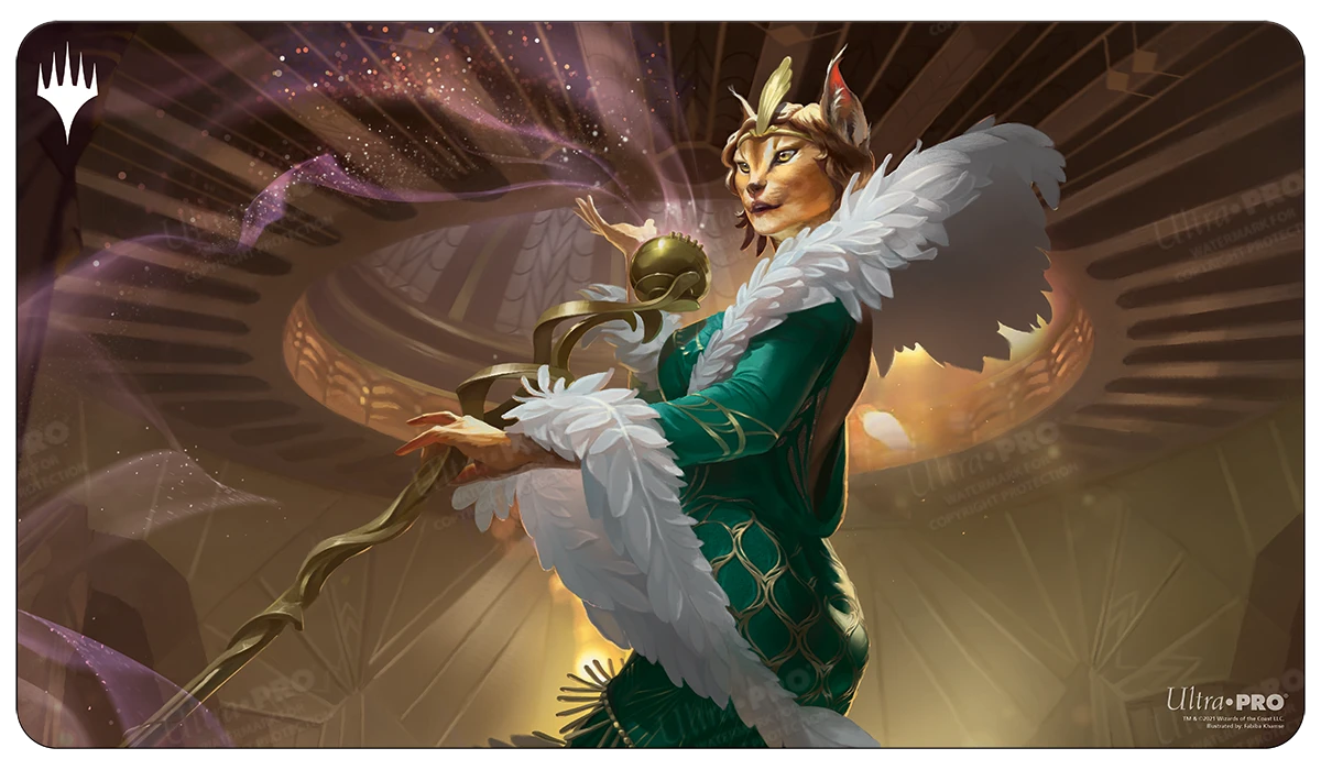 Playmats feature popular Magic: The Gathering Commander artwork of Kitt Kanto, Mayhem Diva by Fabiba Khamse. Made with a soft fabric top to reduce damage to cards during play and a non-slip rubber backing to keep the playmat from shifting during use, playmats enhance the gameplay experience. With dimensions of approximately 24 in. x 13.5 in., a playmat also makes an excellent oversize mousepad for home or office.