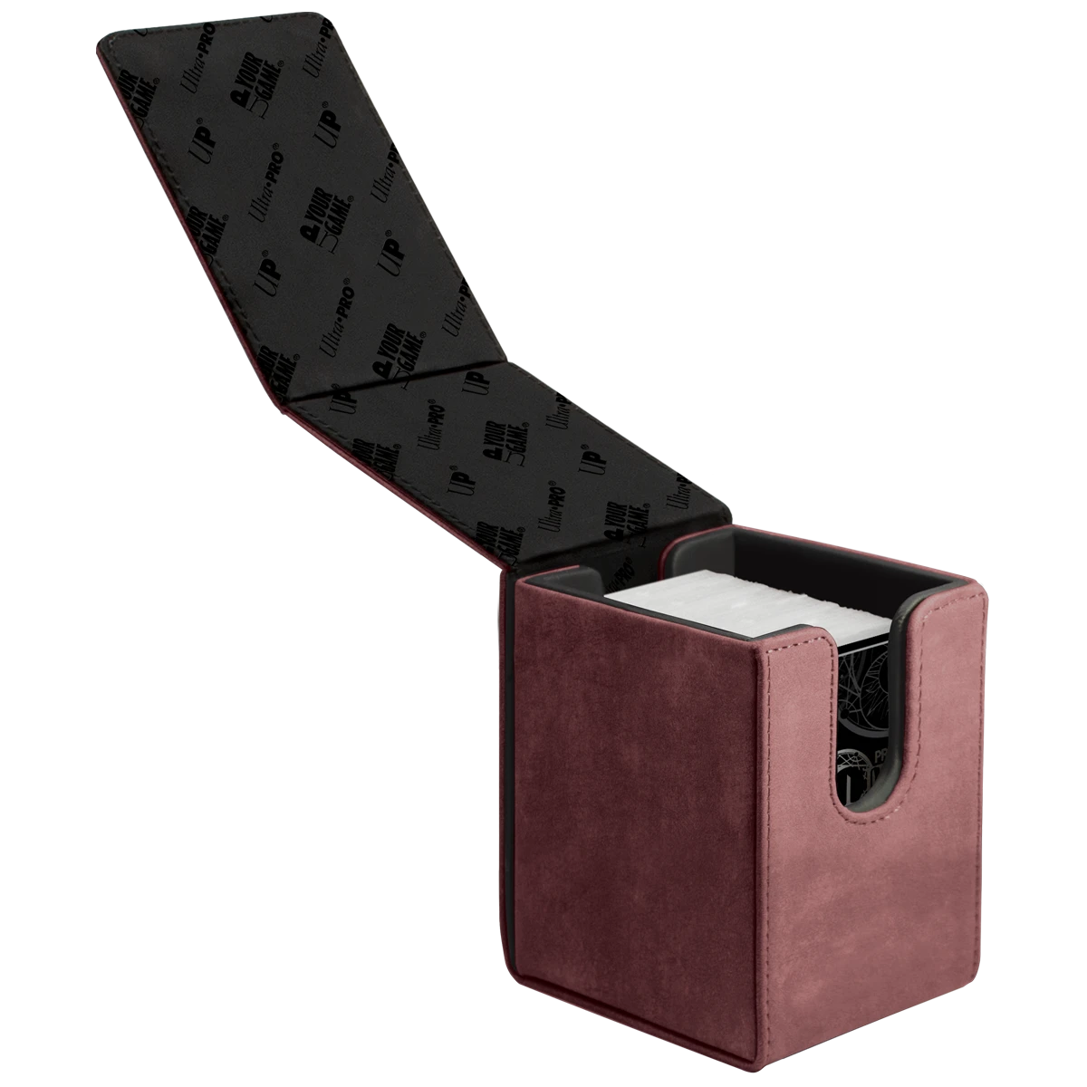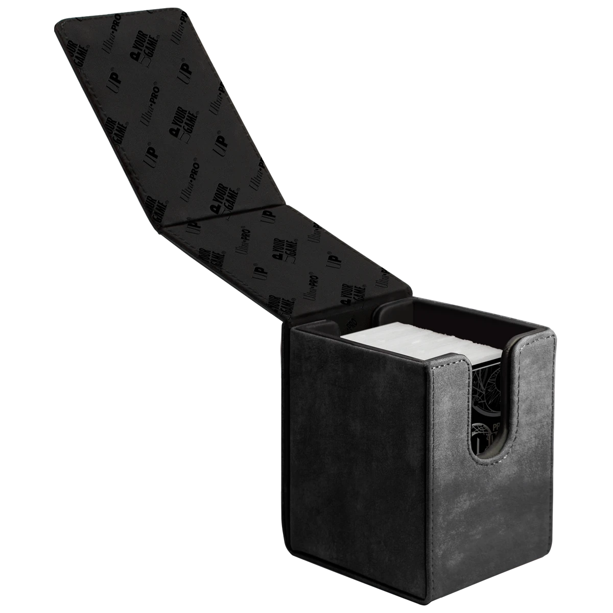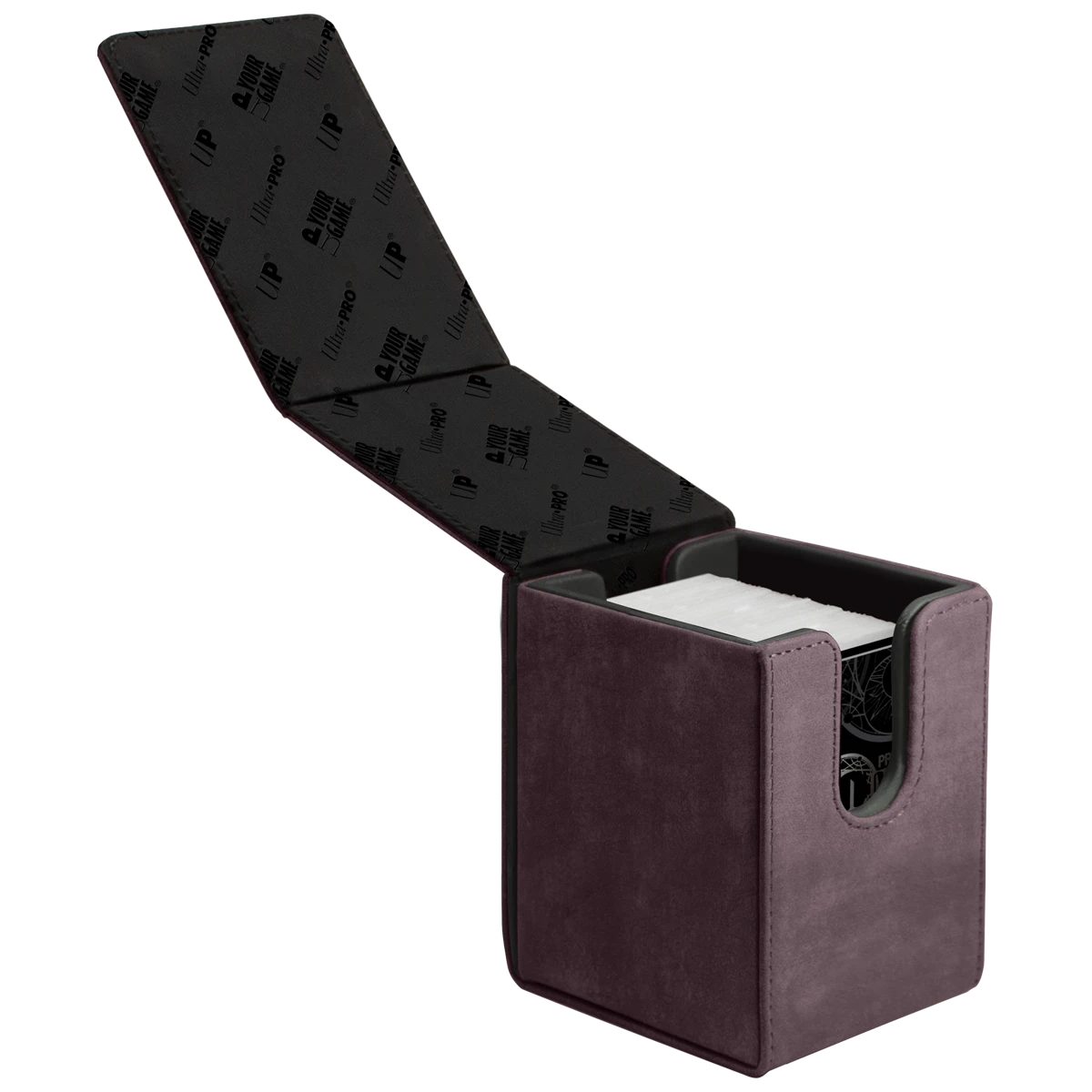 Premium Alcove Flip Box storage cases made with a suede-like material. The Alcove Flip Box can hold up to 100 double sleeved cards with its lid secured by strong magnetic closures utilizing multiple magnets for extra protection. The lid can be undone on both sides of the box to reveal dual thumb notches for easy access to your deck of cards. The Alcove Flip Box is a great storage device for organizing and protecting your collection.
