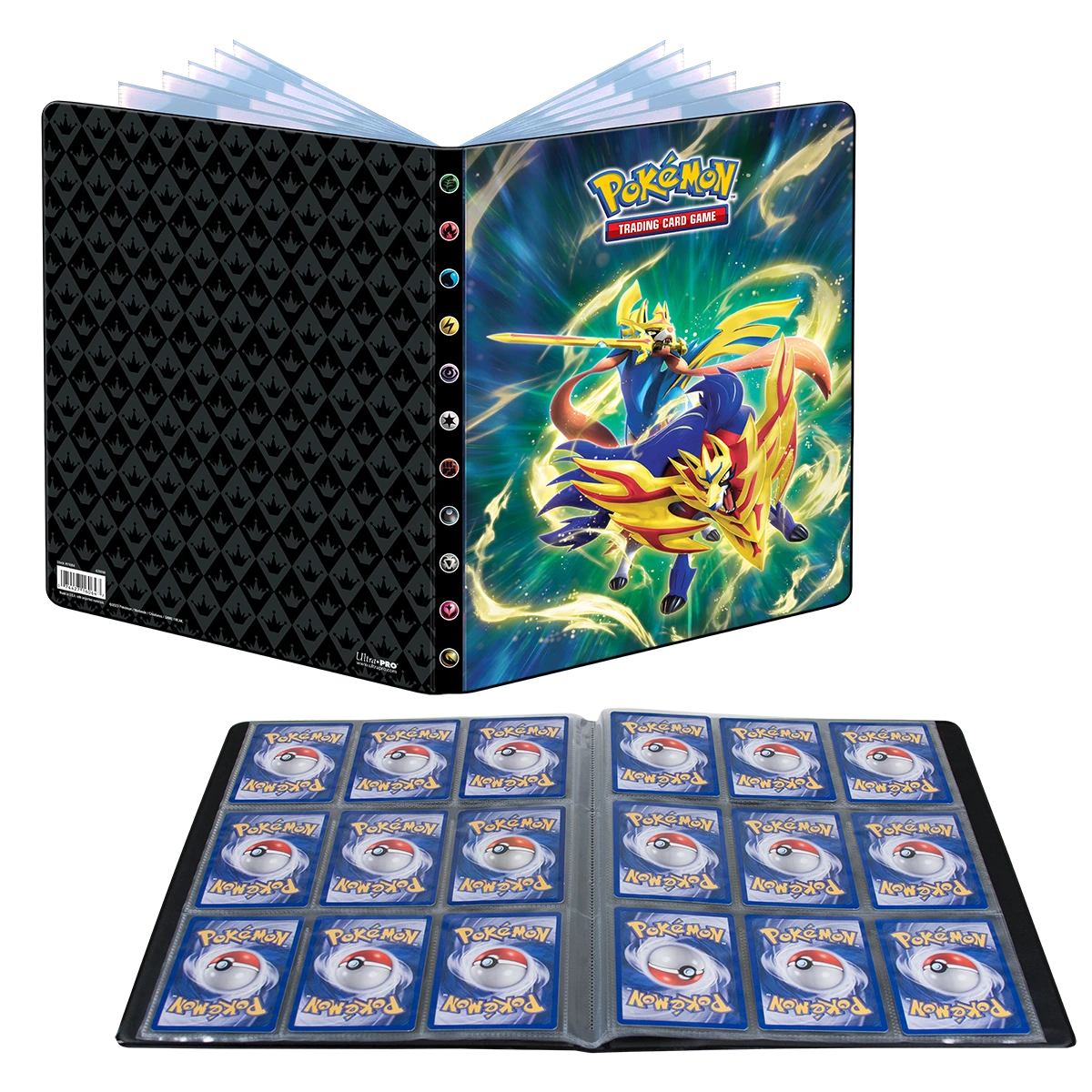 - Officially licensed Pokémon Trading Card Game 9-Pocket Portfolio featuring Crowned Sword Zacian and Crowned Shield Zamazenta